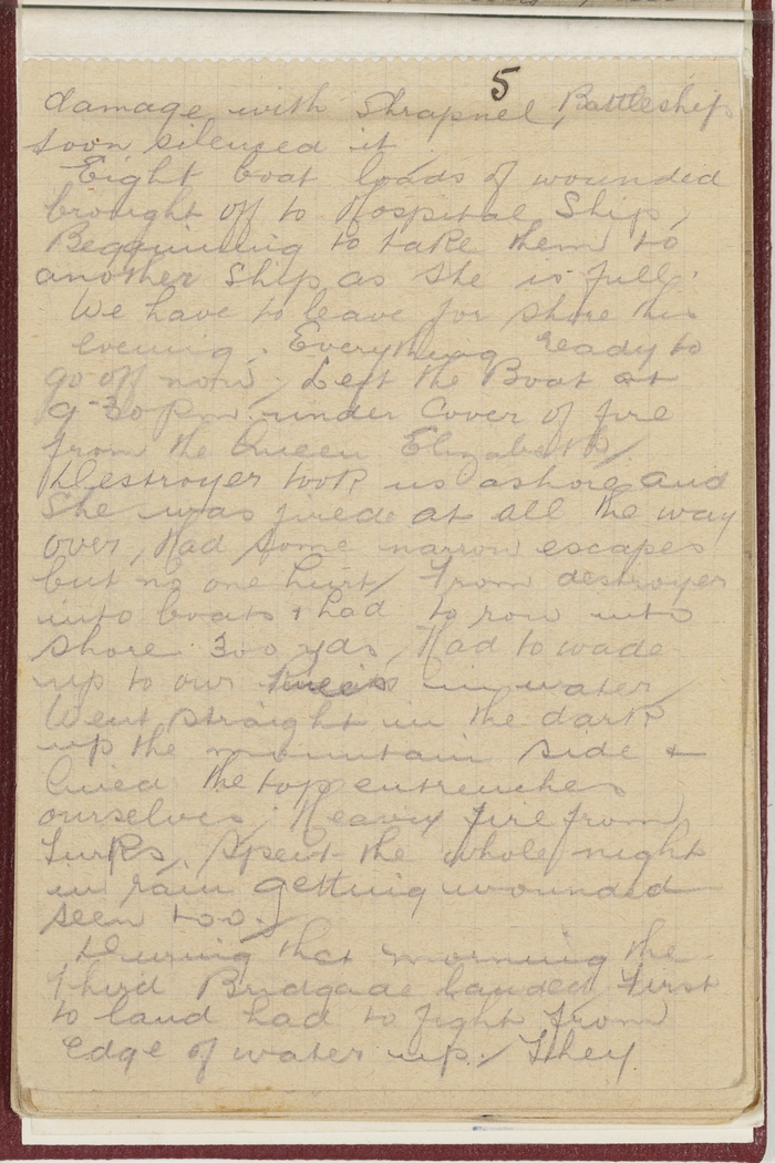 We have to leave for shore this evening. Everything ready to go off now. Left the Boat at 9.30 pm under cover of fire from the Queen Elizabeth. Destroyer took us ashore and she was fired at all the way over. Had some narrow escapes but no one hurt. From destroyer into boats and had to row into shore 300 yds. Had to wade up to our knees in water. Went straight in the dark up the mountain side and lined the top entrenches ourselves. Heavy fire from Turks. Spent the whole night in rain getting wounded seen too.