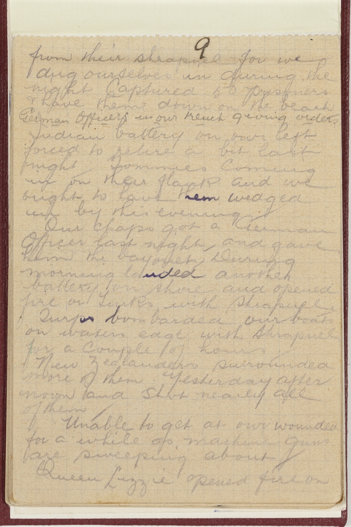 Our chaps got a German Officer last night, and gave him the bayonet. During morning landed another battery on shore and opened fire on the Turks with shrapnel. Turks bombarded our boats on waters edge with shrapnel for a couple of hours.