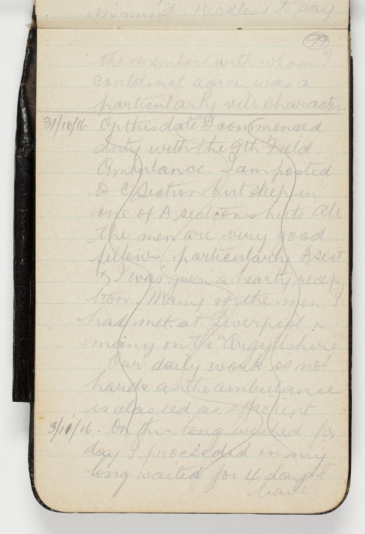 31/10/16 On this date I commenced duty with the 9th Field Ambulance. I am posted to C Section but sleep in one of A Section's huts. All the men are very good fellows, particularly A Sect & I was given a hearty reception. Many of the men I had met at Liverpool & many on the "Argyllshire". Our daily work is not hard as the ambulance is classed as efficient.