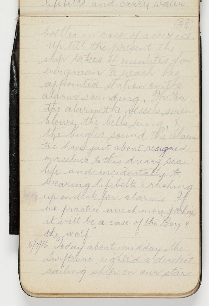 bottles in case of accident. Up till the present, the ship takes 4 minutes for everyman to reach his appointed station on the alarm sounding. For the alarm the vessels siren blows, the bells ring, & the bugles sound the alarm. We have just about resigned ourselves to this dreary sea life and incidentally to wearing lifebelts & rushing up on deck for alarms. If we practice much more perhaps it will be a case of the "Boy and the Wolf".