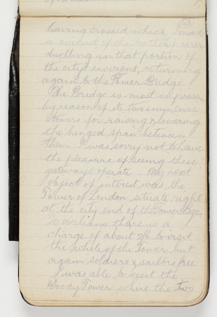 having crossed which, I made a circuit of the rather poorer dwelling in that portion of the city environs, returning again to the Tower Bridge. The Bridge is most impressive by reason of its two immense towers for raising and lowering the hinged span between them. I was sorry not to have the pleasure of seeing these gateways operate. My next object of interest was the Tower of London situate right at the city end of the Tower Bge. To civilians there is a charge of about 2/6 to visit the whole of the Tower but again soldiers & sailors free. I was able to visit the Bloody Tower where the two
