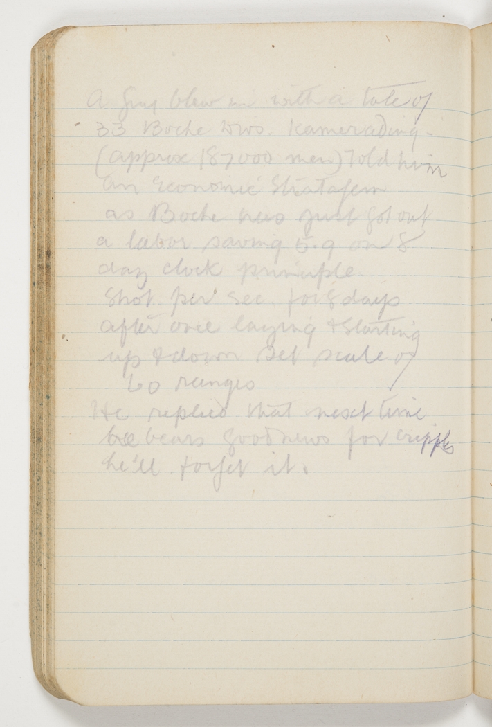 A Guy blew in with a tale of 33 Boche DWs. kamerading (approx. 187000 men). Told him an Economic Stratagem as Boche has just got out a labor saving 5.9 on 8 day clock principle. Shot per sec. for 8 days after once laying & starting up & down, set scale of 60 ranges. He replied that next time he bears good news for cripples he'll forget it.