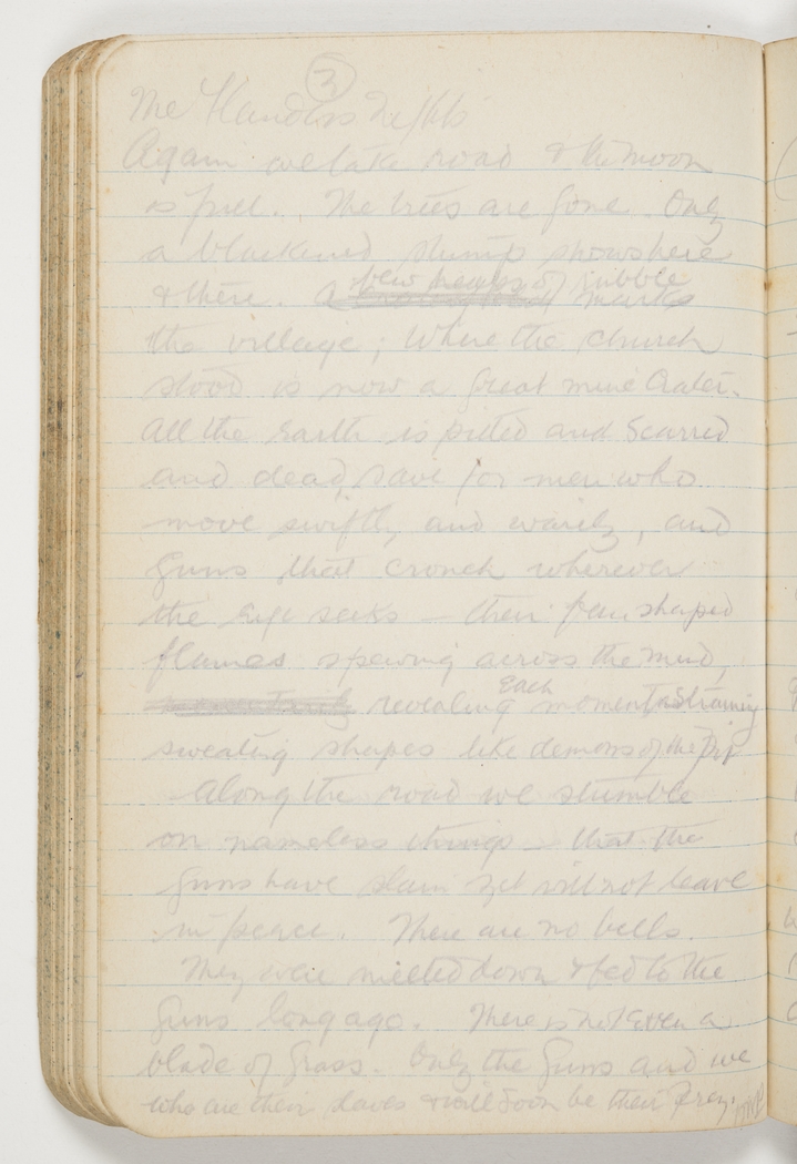 Again we take road & the moon is full. The trees are gone. Only a blackened stump shows here & there. A crater of few heaps of rubble mark the village, where the church stood is now a great mine crater. All the earth is pitted and scarred and dead, save for men who move swiftly and warily, and guns that crunch wherever the eye seeks - their fan shaped flames spewing across the mud, momemtarily revealing each moment straining sweating shapes like demons of the pit. Along the road we stumble on nameless things - that the guns have slain yet will not leave in peace. There are no bells. They were melted down & fed to the guns long ago. There is not even a blade of grass. Only the guns and we who are their slaves & will soon be their prey. HWP