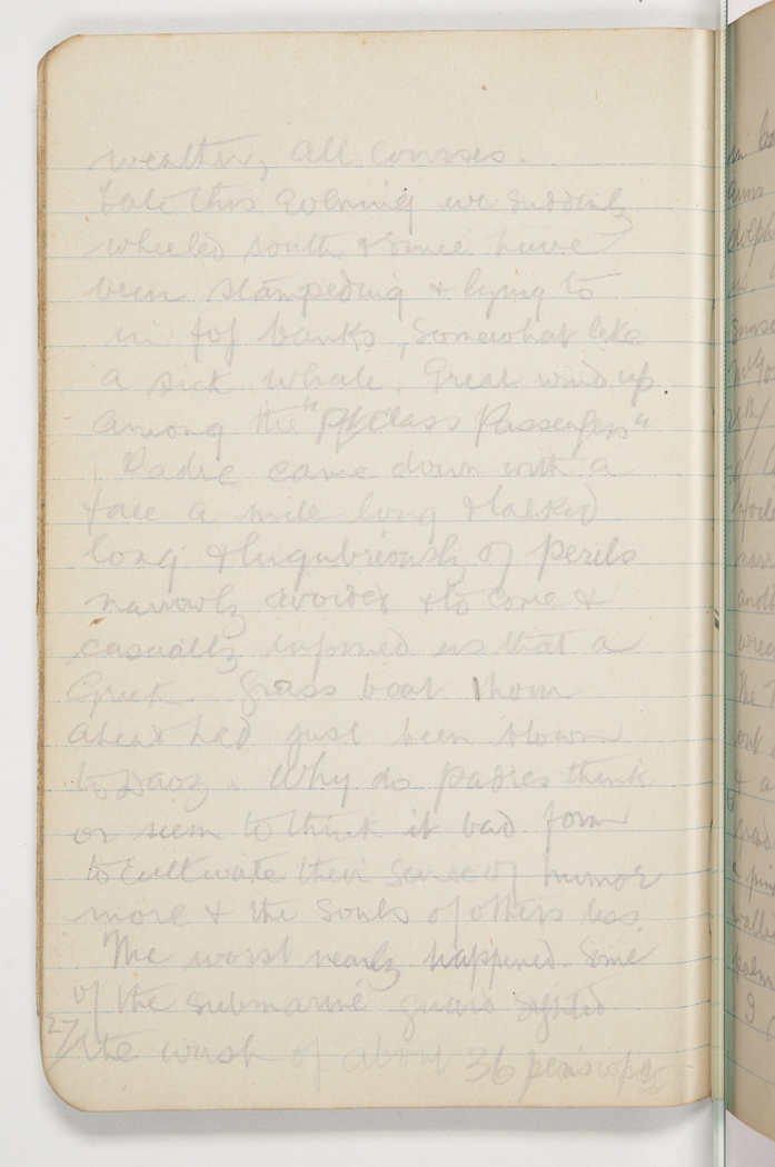weather, all courses. Late this evening we suddenly wheeled south & since have been stampeding & lying to in fog banks, somewhat like a sick whale. Great wind up among the "Pt Class Passangers". Padre came down with a face a mile long & talked long & lugubriously of perils narrowly avoided & to come & casually informed us that a Greek grass boat 1 hour ahead had just been blown to Davy. Why do Padres think or seem to think it bad form to cultivate their sense of humor more & the souls of others less. The worst nearly happened. Some of the submarine guard sighted.
