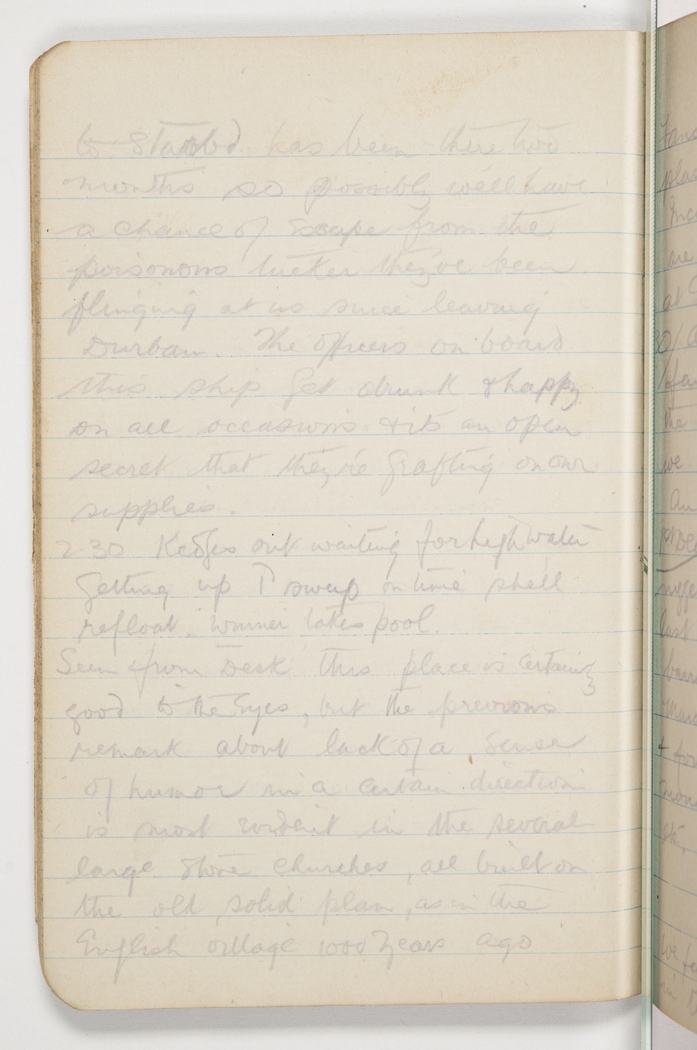 to starbd. has been there two months so possibly we'll have a chance to escape from the poisonous tucker they've been flinging at us since leaving Durban. The officers on board this ship get drunk & happy on all occasions & its an open secret that they're grafting on our supplies.