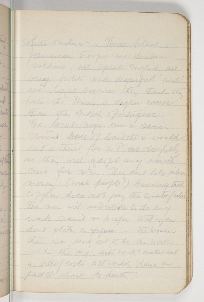 "white Coolies". These black Jamaican troops are dinkum soldiers, all speak English, are very polite and dignified and are loyal because they think they hate the Huns a degree worse than the British & Portugese. The local nigs. are a semi-starved race of bandits & would cut a throat for a 1d as cheerfully as they will adopt any named creed for 2 ½d . They dont like silver money (wise people!) knowing that copper does not pay the counterfeiter. The men will undertake to do any work named & prefer that you dont state a figure - the women then are sent out to do the work while the nig. sits back & makes out a bill of costs that would shame a Pitt St shark to death.