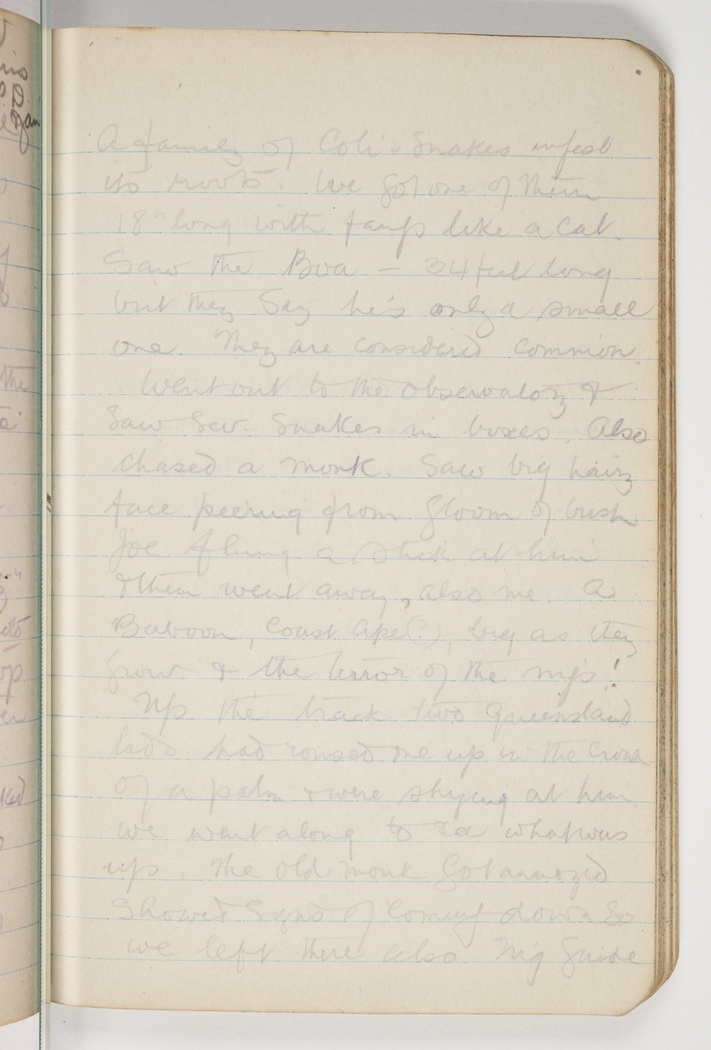 A family of Coli Snakes infest its roots. We got one of them 18" long with fangs like a cat. Saw the Boa - 34 feet long but they say he's only a small one. They are considered common. Went out to the observatory & saw sev. snakes in boxes. Also chased a monk. Saw big hairy face peering from gloom of bush. Joe flung a stick at him & then went away, also me. A Baboon, Coast Ape (?), big as they grow & the terror of the nigs! Up the track two Queensland lads had roused one up in the crown of a palm & were shying at him. We went along to see what was up. The old monk got annoyed showed signs of coming down so we left there also. Nig. guide