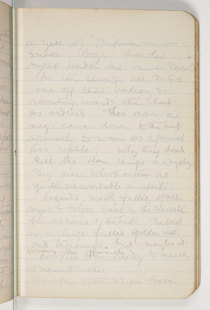 a yell of " Dinkum -- snake, boys! Crawled right under me "-- ear". In ten seconds all M.Gs were off that balcony & roosting inside the hut as ordered. This a.m. a nig. came down to the hut specially to warn us against this reptile, why they don't kill the dam things is a mystery. They seem to look on them as quite unavoidable incidents. Lizards, mostly frilled, of all sizes & colors bask on the concrete foundations of the huts. The best is a large frilled golden with red tracings, but maybe it was the punch! Notified to be ready to march at moment's notice. Saw four of the ships leave