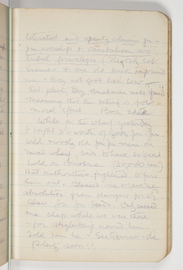 tolerated and openly claim ju-ju worship & cannibalism as tribal privileges. (They only eat enemies & one old buck informed me "Boy not good like cow - Eat plenty Boy, Bushman make fraid" meaning that the eating is for moral effect. Bon Idée. While on the wharf yesterday I bought 2 ½ worth of good Ju-Ju. Wild & wooly old Ju Ju man on naval wharf, said to have so great hold on Bushmen (30,000 here) that authorities frightened to fire him out. Blessed me & gave me absolution from dangers for 2 ½d, also Ju Ju beads. Only cursed one chap while we were there - for skylarking round him. Told him he "See German - die Plenty soon!"