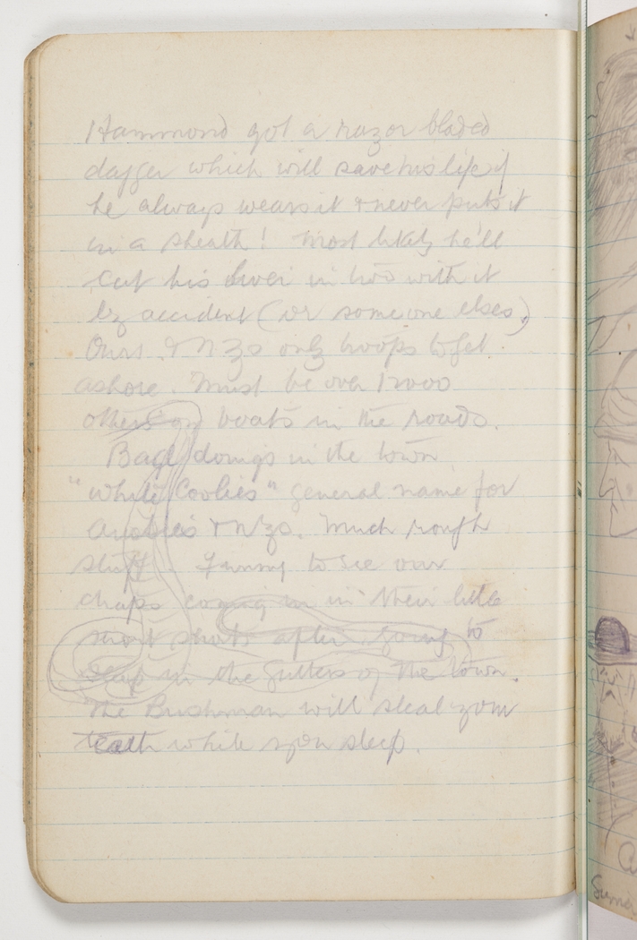 Hammond got a razor bladed dagger which will save his life if he always wears it & never puts it in a sheath! Most likely he'll cut his liver in two with it by accident (or someone elses). Ours & N.Zs only troops to get ashore. Must be over 12000 others on boats in the roads. Bad doings in the town. "White Coolies" general name for Aussies & N.Zs. Much rough stuff. Funny to see our chaps coming in in their little short shorts after going to sleep in the gutters of the town. The Bushmen will steal your teeth while you sleep.