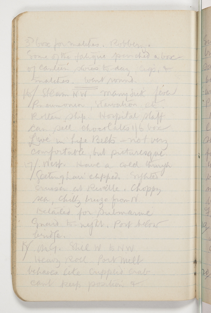 16th Steam NW, many sick, fever, Pneumonia, Starvation etc. Rotten ship. Hospital staff can sell chocolates 1/6 box. Live in Life Belts - not very comfortable, but picturesque.