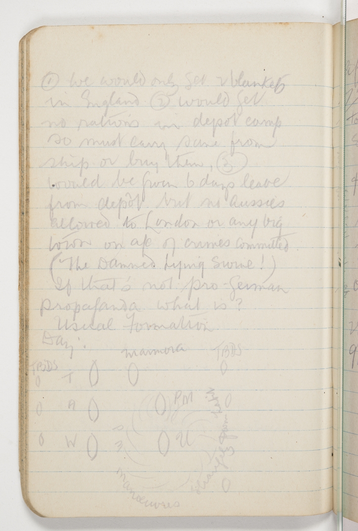 (1) we would only get 2 blankets in England, (2) would get no rations in depot camp so must carry same from ship or buy them, (3) would be given 6 days leave from depot but no Aussies allowed to London or any big town on a/c of crimes committed. (The Damned Lying Swine.) If that is not pro-German propaganda what is?