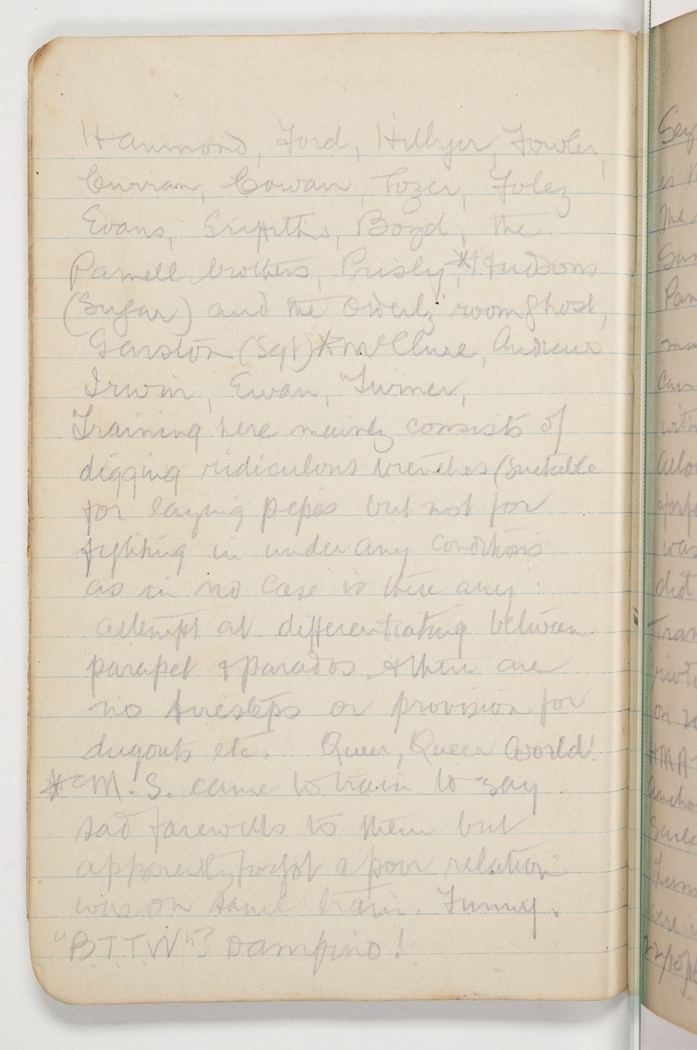 Training here mainly consists of digging ridiculous trenches (suitable for laying pipes but not for fighting in under any conditions as in no case is there any attempt at differentiating between parapet & parados & there are no firesteps or provision for dugouts etc. Queer, Queer World.