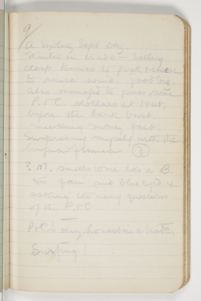 9/   A Sydney Sept Day.    Started in trade   - selling clasp knives to pork & cheese to raise wind.   Good biz.   Also managed to pass some P. & C. dollars at Hut, before the bank bust, making money fast.   Surprising myself with the lingua franca (?)