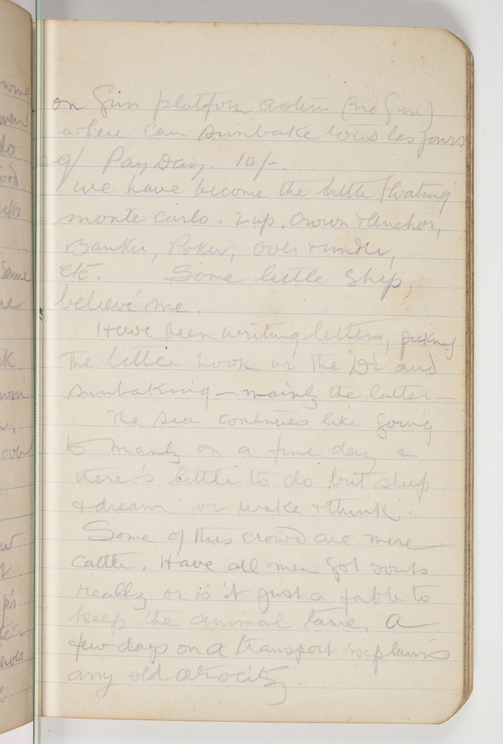 Have been writing letters, picking the little nook or the Di and sunbaking - mainly the latter. The sea continues like going to Manly on a fine day & there's little to do but sleep & dream or wake & think. Some of this crowd are mere cattle. Have all men got souls really or is it just a fable to keep the animal tame. A few days on a transport explains any old atrocity.