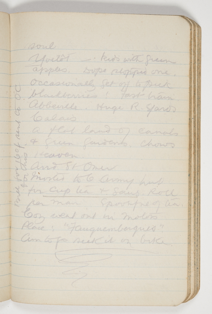 soul. Yvetôt - kids with green apples. Dope stopped one. Occasionally get off to pick blackberries! Fast train. Abbeville, huge R. Yards, Calais. A flat land of canals & green gardens. Chows Heaven. And St Omer. Invited to 6 Army hut for cup tea & Saus. Roll per man, spoonful of tea.