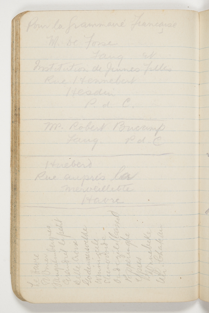 Le Havre, St Omer, Fauquembergues, Grandiel le petit, Belle Croix, Godewaersvelde, Winnizeele, Steenvoorde, Oudezéle [Oudezeele] (Cassel), Popperinghe, Ypres, Zonnebeke, Uli [?] Chateau.