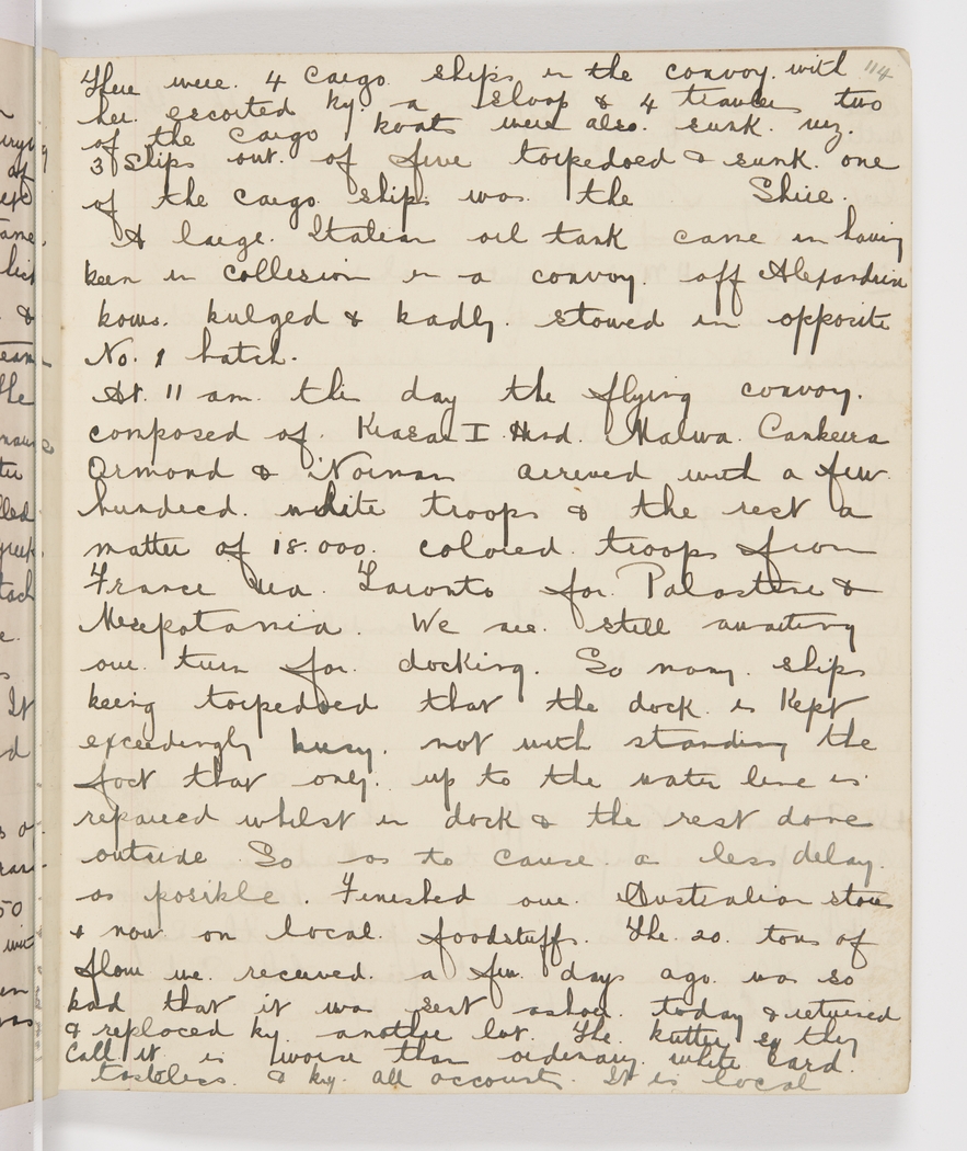 At 11 am this day the flying convoy composed of Kiasar I Hind, Malwa, Canberra, Ormond & Norman arrived with a few hundred white troops & the rest a matter of 18,000 colored troops from France via Taronto for Palastine & Mesepotamia. We are still awaiting our turn for docking. So many ships being torpedoed that the dock is kept exceedingly busy not with standing the fact that only up to the water line is repaired whilst in dock & the rest done outside so as to cause as less delay as possible.