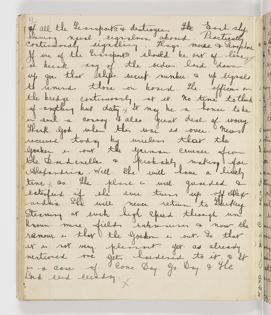 It may be a honor to be in such a convoy & also great deal of worry. Thank God when this war is over. News received today by wireless that the Goeben is out, the German cruiser from the Dardenelles & probably making for Alexandria. Well she will have a lively time as this place is well guarded & satisfied if she ever turns up off Alexandria she will never return to Turkey.