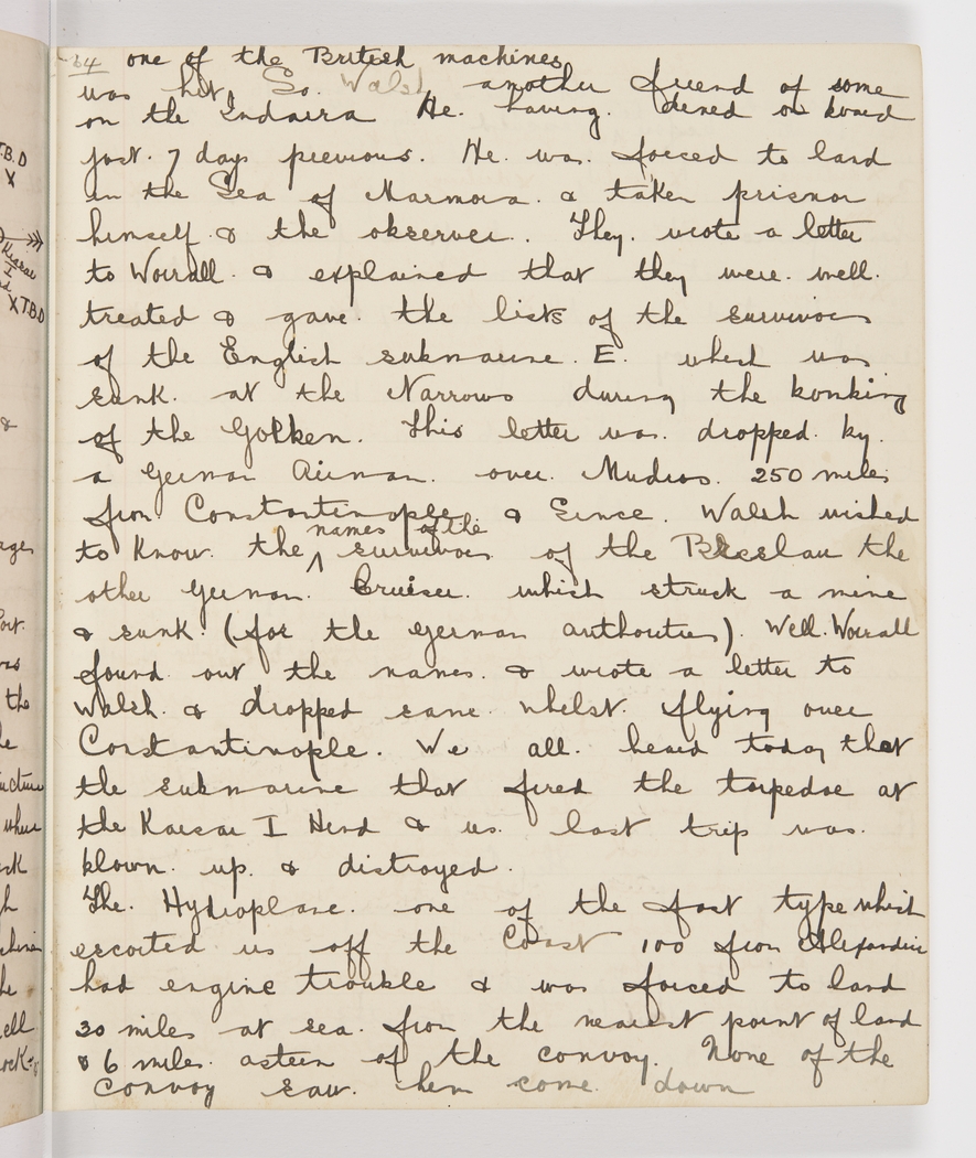 one of the British machines was hit. So Walsh another friend of some on the Indarra he having dined on board just 7 days previous. He was forced to land in the Sea of Marmara & taken prisnor himself & the observer. They wrote a letter to Worrall & explained that they were well treated & gave the lists of the survivors of the English submarine E. which was sunk at the Narrows during the bombing of the Goeben. This letter was dropped by a German Airman over Mudros 250 miles from Constantinople & since Walsh wished to know the names of the survivors of the Breslau the other German Cruiser which struck a mine & sunk (for the German authorities). Well Worrall found out the names & wrote a letter to Walsh & dropped same whilst flying over Constantinople.
