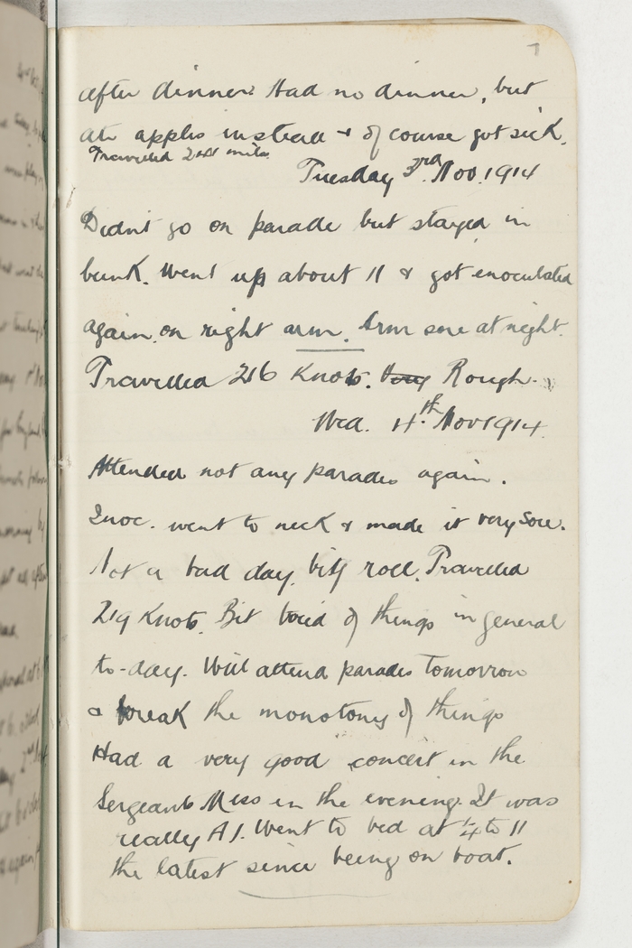 Not a bad day. Big roll. Travelled 219 Knots. Bit tired of things in general to-day. Will attend parades tomorrow & break the monotony of things.