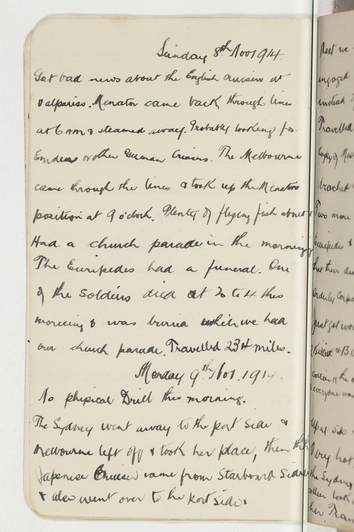 Got bad news about the English cruisers at Valpariso. Menator came back though line at 6 AM & steamed away. Probably looking for Emden or other German Cruisers. The Melbourne came through the lines & took up the Menator position at 9 o'clock. Plenty of flying fish about.
