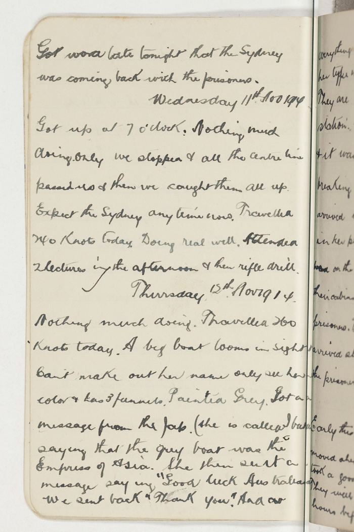 Nothing much doing. Travelled 260 Knots today. A big boat looms in sight. Can't make out her name only see her color & has 3 funnels. Painted Grey. Got a message from the Jap (she is called Ibuki) saying that the grey boat was the Empress of Asia. She then sent a message saying "Good luck Australians. We sent back "Thank you". And