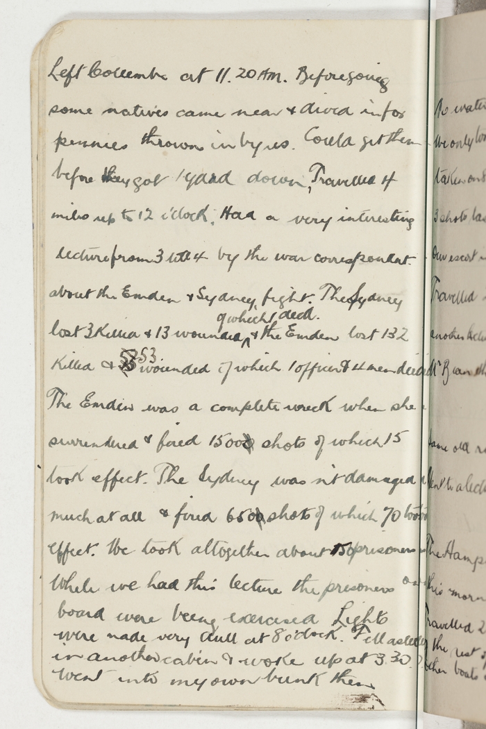 Left Columbo at 11.20 AM. Before going some natives came near & dived in for pennies thrown in by us. Could get them before they got 1 yard down. Travelled 4 miles up to 12 o'clock. Had a very interesting lecture from 3 till 4 by the war correspondent about the Emden & Sydney fight. The Sydney lost 3 Killed & 13 wounded of which 1 died. & the Emden lost 132 Killed & 52 53 wounded of which 1 officer & 4 men died. The Emden was a complete wreck when she surrendered & fired 1500 0 shots of which 15 took effect. The Sydney wasn't damaged much at all & fired 650 0 shots of which 70 took effect. We took altogether about 150 prisoners. While we had this lecture the prisoners on board were being exercised. Lights were made very dull at 8 o'clock. Fell asleep in another cabin & woke up at 3.30. Went into my own bunk then.