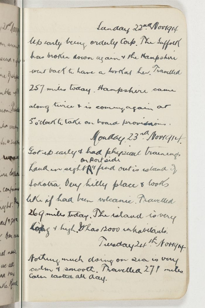 Up early being orderly Corp. The Suffolk has broken down again & the Hampshire went back to have a look at her. Travelled 257 miles today. Hampshire came along twice & is coming again at 5 o'clock to take on board provisions.