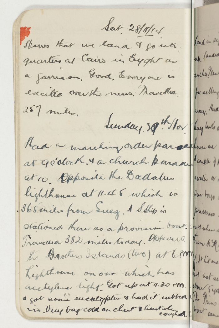 Had a marching order parade at 9 o'clock. & a church parade at 10. Opposite the Daedalus lighthouse at 11.45 which is 365 mile from Suez. A S. Ship is stationed there as a provision boat. Travelled 382 miles today. Opposite the Brothers Islands (two) at 6 PM. Lighthouse on one which has acetylene light. Got up at 11.30 PM. & got some eucalyptus & had it rubbed in. Very bad cold on chest & hurt when coughed.