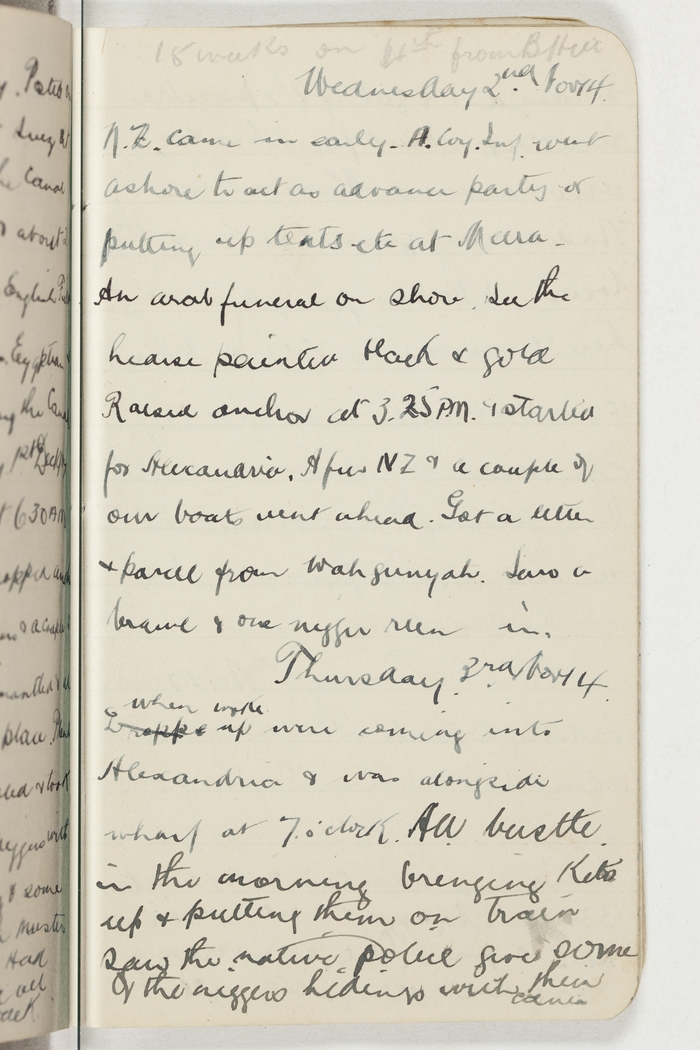 N.Z. came in early. A. Coy. Inf. Went ashore to act as advance party or putting up tents etc. at Mena. An Arab funeral on shore. See the hearse painted black & gold