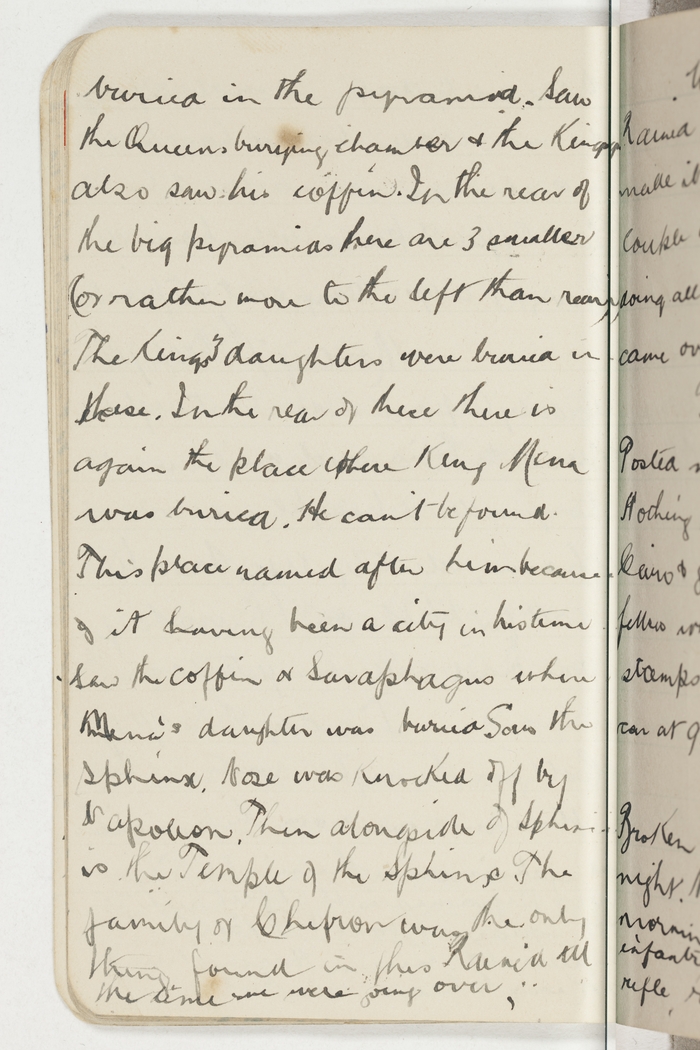 buried in the pyramid. Saw the Queen's burying chamber & the Kings also saw. his coffin. In the rear of the big pyramids there are 3 smaller (or rather more to the left than rear) The Kings 3 daughters were buried in these. In the rear of these there is again the place where King Mena was buried. He can't be found. This place named after him because of it having been a city in his time. Saw the coffin or Sacaphagus where Mena's daughter was buried. Saw the Sphinx. Nose was knocked off by Napoleon. Then alongside of Sphinx is the Temple of the Sphinx. The family of [indecipherable] was the only thing found in this. Rained all the time we were going over.