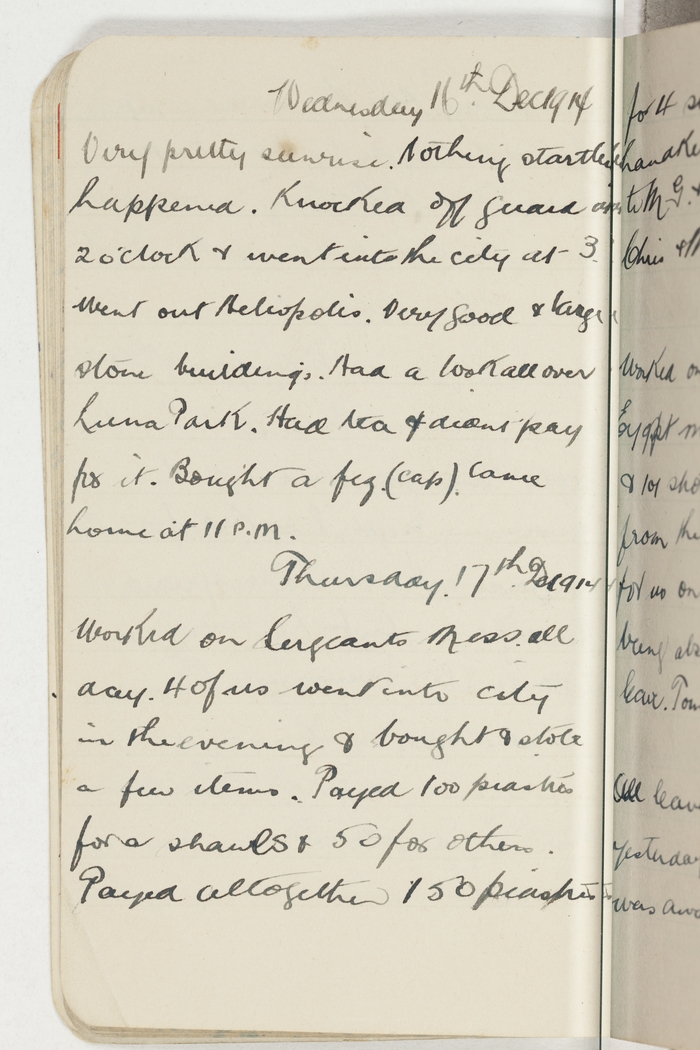 Very pretty sunrise. Nothing startling happened. Knocked off guard at 2 o'clock & went into the city at 3. Went out to Heliopolis. Very good & large stone buildings. Had a look all over Luna Park. Has tea & didn't pay for it. Bought a fez (cap). Came home at 11 P.M.