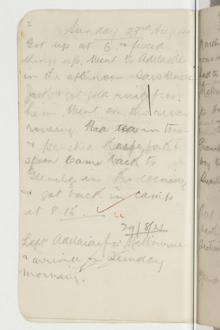 fixed things up. Went to Adelaide in the afternoon. Saw Uncle Jack & got gold ring from him. Went on the river rowing. Had tea in town & pinched Knife, fork & spoon. Came back to Glenelg in the evening &