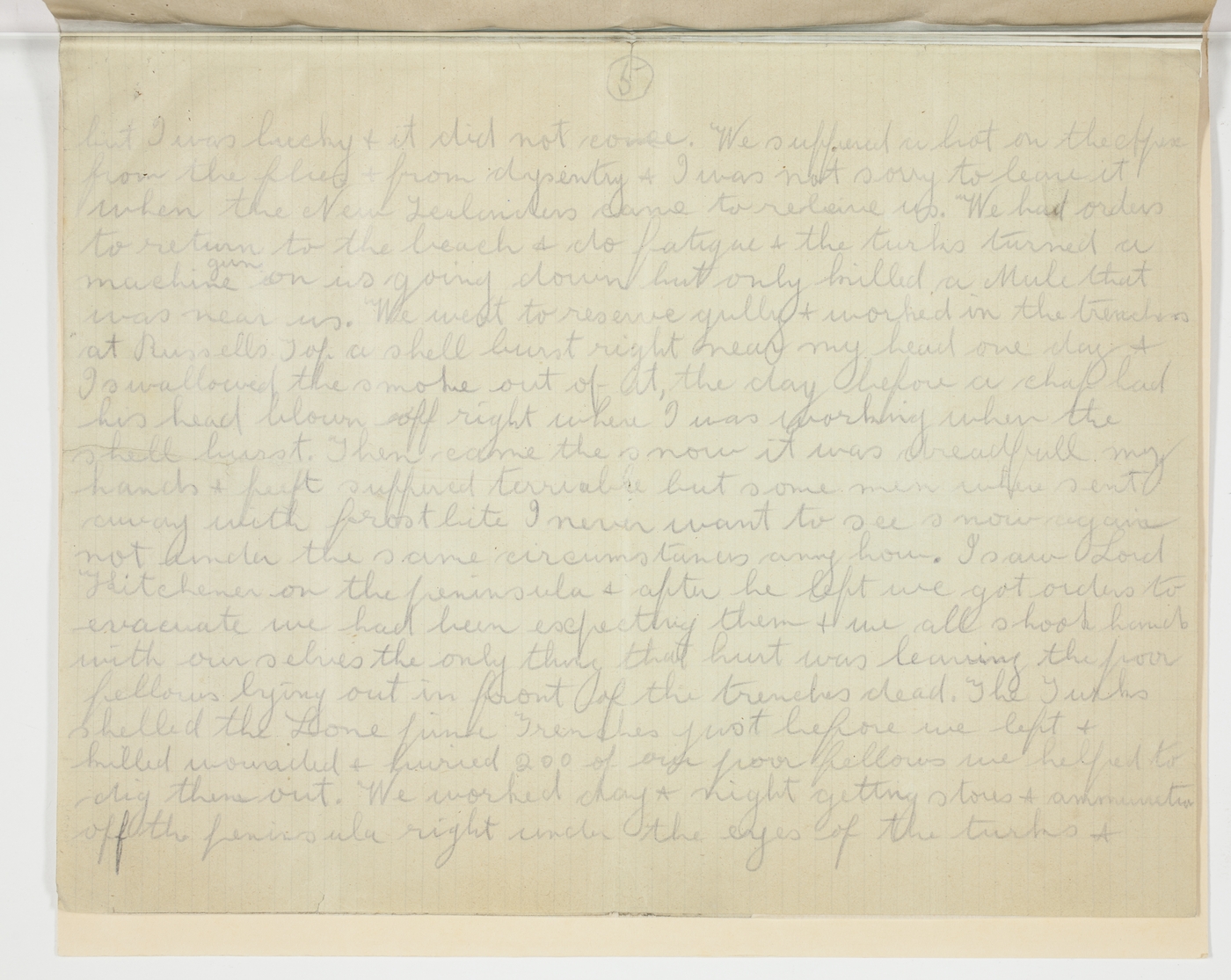 But I was lucky and it did not come. We suffered a lot on the Apex from the flies from dysentery and I was not sorry to leave it when the New Zealanders came to releive us. We had orders to return to the beach and do fatigue and the turks turned a machine gun on us going down but only killed a mule that was near us. We went to reserve gully and worked in the trenches at Russells Top a shell burst right near my head one day and I swallowed the smoke out of it the day before a chap had his head blown off right where I was working when the shell burst. Then came the snow it was dreadful my hands and feet suffered teribble but some men were sent away with frost bite I never want to see snow again not under the same circumstances any howl.
