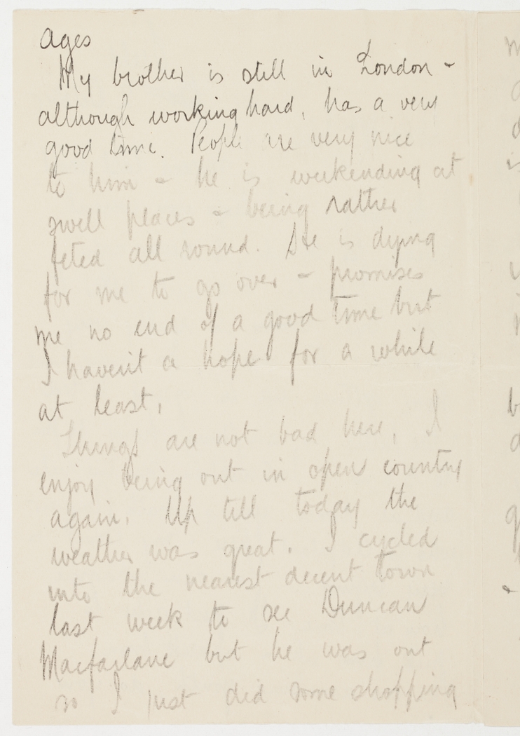 My brother is still in London & although working hard, has a very good time. People are very nice to him & he is weekending at swell places & being rather feted all round. He is dying for me to go over & promises me no end of a good time but I haven't a hope for a while at least.