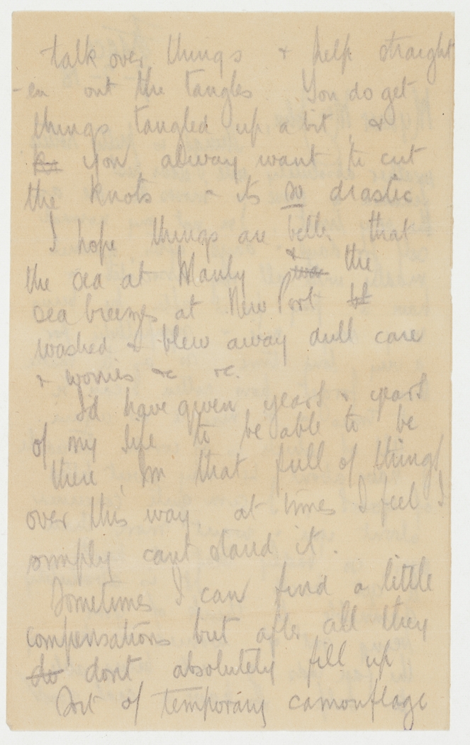 talk over things & help straighten out the tangles. You do get things tangled up a bit & you alway want to cut the knots & its so drastic. I hope things are better that the sea at Manly & the sea breezes at New Port washed & blew away dull care & worries &c., &c.