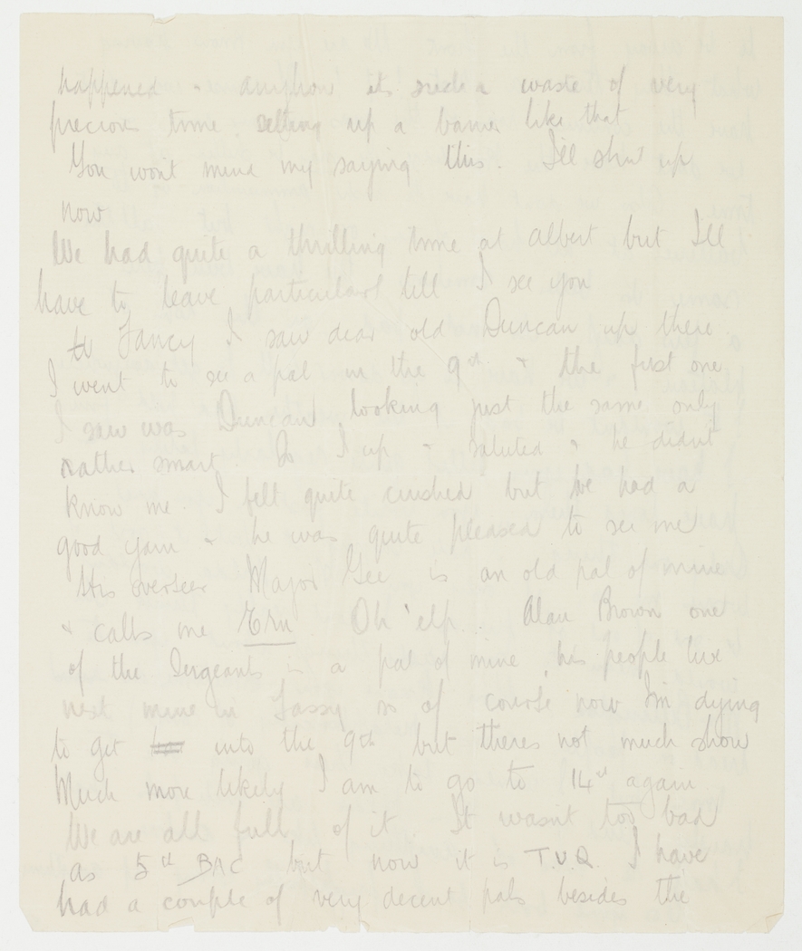 Fancy I saw dear old Duncan up there. I went to see a pal in the 9th & the first one I saw was Duncan looking just the same only rather smart. So I up & saluted & he didn't know me. I felt quite crushed but we had a good yarn & he was quite pleased to see me. His overseer, Major Gee, is an old pal of mine & calls me Ern. Oh 'elp. Alan Brown one of the Sergeants is a pal of mine, his people live next mine in Tassy so of course now I'm dying to get into the 9th but there's not much show. Much more likely I am to go to 14th again. We are all full of it. It wasn't too bad as 5th B.A.C. but now it is T.U.Q. I have had a couple of very decent pals besides the