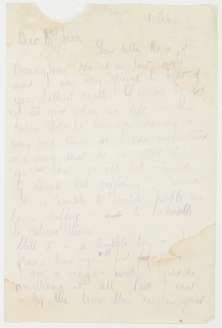 Your letter No. 4 of Boxing Day reached me last night and I was very grieved to hear of your Father's death. Of course he was not too good when we left & Miss Hilda told he has was having a very bad time so I can understand in a way that he was glad to go & that you all feel relieved to think his suffering is ended. It is terrible to watch people one loves suffer & not to be unable to relieve them.