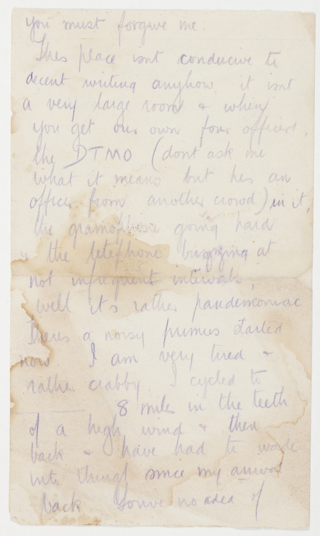 this place isn't conducive to decent writing anyhow, it isn't a very large room & when you get our own four officers, the D.T.M.O. (don't ask me what it means but he's an officer from another crowd) in it, the gramophone going hard & the telephone buzzing at not infrequent intervals, well it's rather pandemoniac. There's a noisy primus started now. I am very tired & rather crabby, I cycled to --- 8 miles in the teeth of a high wind & then back & have had to wade into things since my arrival back. You've no idea of