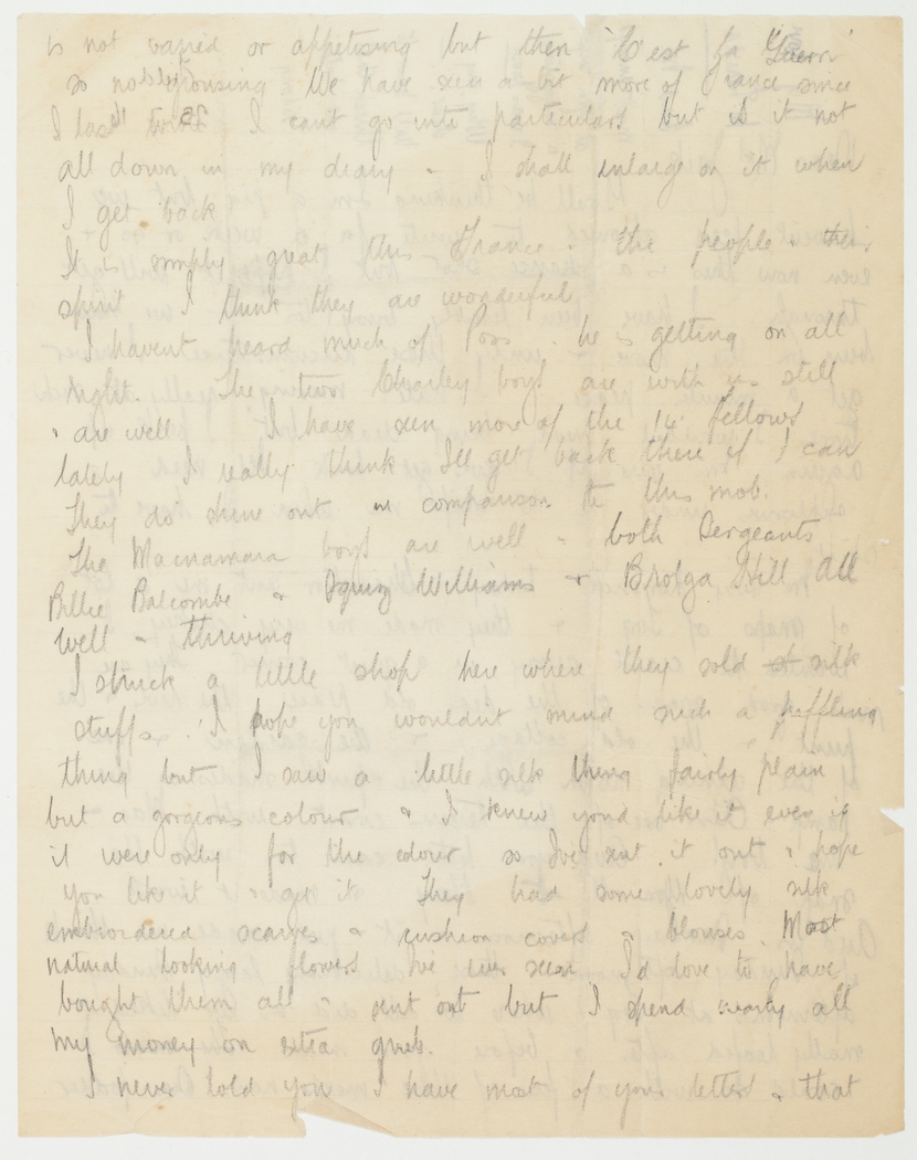 I struck a little shop here where they sold silk stuffs. I hope you wouldn't mind such a piffling thing but I saw a little silk thing fairly plain but a gorgeous colour & I knew you'd like it even if it were only for the colour so I've sent it out & hope you like it & get it. They had some lovely silk embroidered scarves & cushion covers & blouses. Most natural looking flowers I've ever seen. I'd love to have bought them all & sent out but I spend nearly all my money on extra grub.