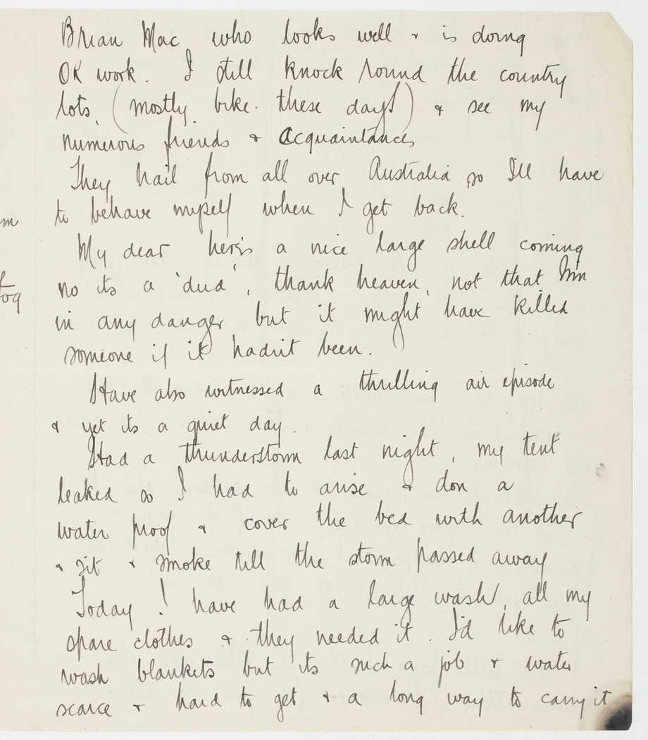 Had a thunderstorm last night, my tent leaked so I had to arise & don a water proof & cover the bed with another & sit & smoke till the storm passed away. Today I have had a large wash, all my spare clothes & they needed it. I'd like to wash blankets but its such a job & water scarce & hard to get & a long way to carry it.