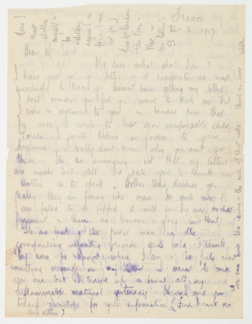 My dear what shall I do, I have just got your letter & it exasperates me most exceedingly to know you haven't been getting my letters, I don't wonder you feel you want to kick me but I vow & declare to you, on bended knee that for once I write to that dear irresponsible child Lerida I write thrice or fource to your highness. I really don't know why you don't get them. Its so annoying not that my letters are much but still I'd hate you to think me untrue, so to speak. Bother these Archies, yes really they are firing like mad. I'm quite sure if I am fated to be pipped it will be by an archie fragment & then no honour & glory in that. You are making the postal man in the corresponding infantry brigade quite wild I think. By now he knows where I am & he puts most insulting messages on my letters. I meant to send you one but I tidied up & burnt all my inflammable material yesterday. However I send you today's envelope for your information. (Find I can't do this either.)
