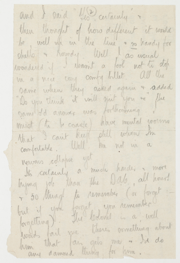 and I said "Yes, certainly" & then thought of how different it would be, well up in the line & so handy for shells & rowdy, well I as usual wondered if I wasn't a fool not to stop in a nice cosy comfy billet. All the same when they asked again & added "Do you think it will suit you &c" the same old answer was forthcoming. I must (to be coarse) have mental worms that I can't keep still when I'm comfortable. Well, I'm not in a nervous collapse yet.