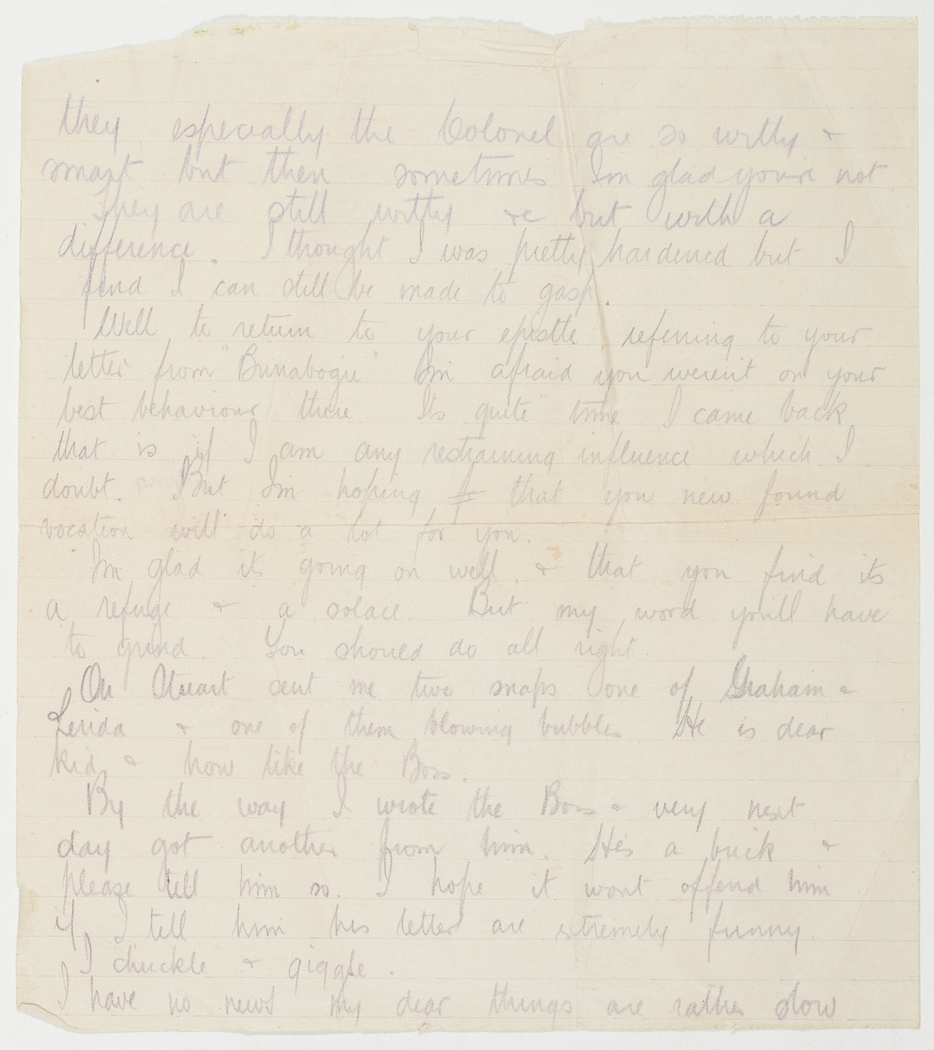 Well to return to your epistle, referring to your letter from "Burrabogie", I'm afraid you weren't on your best behaviour there. Its quite time I came back that is if I am any restraining influence which I doubt. But I'm hoping that your new found vocation will do a lot for you.
