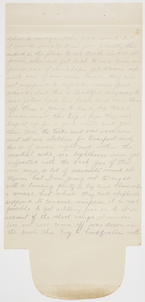 liked to carry on this good work, but it would simply turn you ghastly. this indeed is the place to see death in all its form's, when we got back to our lines we found one of our chaps got blown up with one of our own bomb's they are not supposed to explode under four seconds but this is doubtful anyway the poor fellow had his head and arm blown off, there is going to be a big naval bombardment this Evg I hope they will keep it up for a good while and give them Hell, the Turks sent over word we must not use stretchers for transport work this is of course right and within the martial code, six lighthorse men got suffocated with the back gas of their own mine a lot of accidents round at Moones Post. I am going out to night with a bombing party to try and blow up a small hut which they call shepherds supposed to conceal snipers, it is not possible to get artillary fire on to it on account of the short range, I wonder how we will come off was down on the beach this Evg to headquarters with