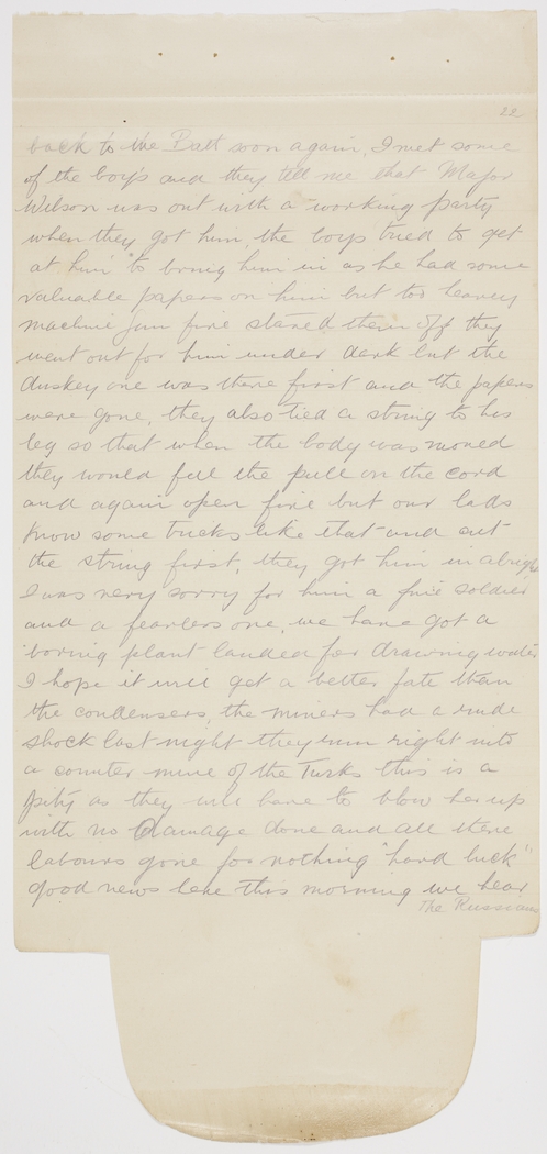back to the Batt soon again, I met some of the boy's and they tell me that Major Wilson was out with a working party when they got him, the boys tried to get at him to bring him in as he had some valuable papers on him but too heavey machine gun fire stared them off they went out for him under dark but the duskey one was there first and the papers were gone, they also tied a string to his leg so that when the body was moved they would feel the pull on the cord and again open fire but our lads know some tricks like that and cut the string first, they got him in alright I was very sorry for him a fine soldier and a fearless one, we have got a boring plant landed for drawing water I hope it will get a better fate than the condensers, the miners had a rude shock last night they run right into a counter mine of the Turks this is a pity as they will have to blow her up with no damage done and all there labours gone for nothing "hard luck" good news here this morning we hear The Russians
