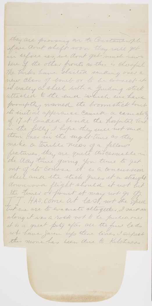 they are pressing on to Constantinople if we dont shift soon they will get in before us, we dont get much news here of the other fronts so this is cheerful The Turks have started sending over a new class of bomb or to be correct it is really a shell with a Guiding stick attached to the end, which we have promptly named the broomstick bomb its initial apperance caused a casuality of 17 it landed beside the hospital tent in the gully. I hope they will not send them over in the night time as they make a terrible mess of a fellows features, they are quite discernable in the day time giving you time to get out of its course it is a concussion shell and the stick gives it a straight downword flight should it not hit the timer or point it may not go off. II. HAS, come at last, not the spell but we are to evacuate altogether. I said all along it was a rock not to be pushed over it is a great pity after all the fine lads who have given up there lives I expect this move has been due to Kitchners
