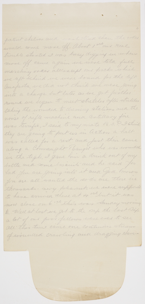 patent shelves and washstand than the order would come move off. About 1ock our real trouble started I was busy digging in when move off came again we were told full marching order all except our packs which we left behind we were bound for the left Anafarta, we did not think we were going into a charge but later as we got further round we began to meet stretcher after stretcher taking the wounded to dressing stations and the noise of rifle machine and artillary fire was terrific, I said to my mate R.I.P. I think they are going to put us in Action a halt was called for a rest and just then came along a Connaught Ranger who was wounded in the tigh, I gave him a drink out of my bottle and some biscuits and he said Yes lad you are going into it and God knows you are all wanted the sods are there in thousands - very pleasant. we were supposed to have arrived there at 4ock but it was now close on 6ock this was Sunday morning to. Well at last we got to the sap the last sap a lot of our poor fellows were ever to see all this time came one continuous stream of wounded crawling and dragging them-