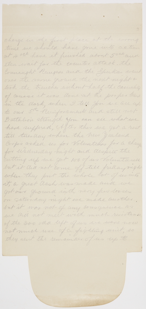 charge in the first place at the wrong time we should have gone into action at 4ock have it finished about 5ock and then wait for the counter attack. the Connaught Rangers and the Gurkas went over the same gournd the next night & took the trenches without half the casuality of course it was done at the proper time in the dark, when I tell you we are up to our 5th Reinforcements and still not Battalion strength you can see what we have suffered, After this we got a rest till tuesday when the New Zealand Corps asked us for Volunteers for a charge for Wednesday night and despite the cutting up we got 100 of us Volunteered but it did not come off till friday night when they put the whole lot of us into it, a great dash was made and we got our ground with very few losses on Saturday night we made another but it was not of any consequence as we did not meet with much resistance of the 200 odd left of us we were now not much use of a fighting unit, so they sent the remainder of us up to